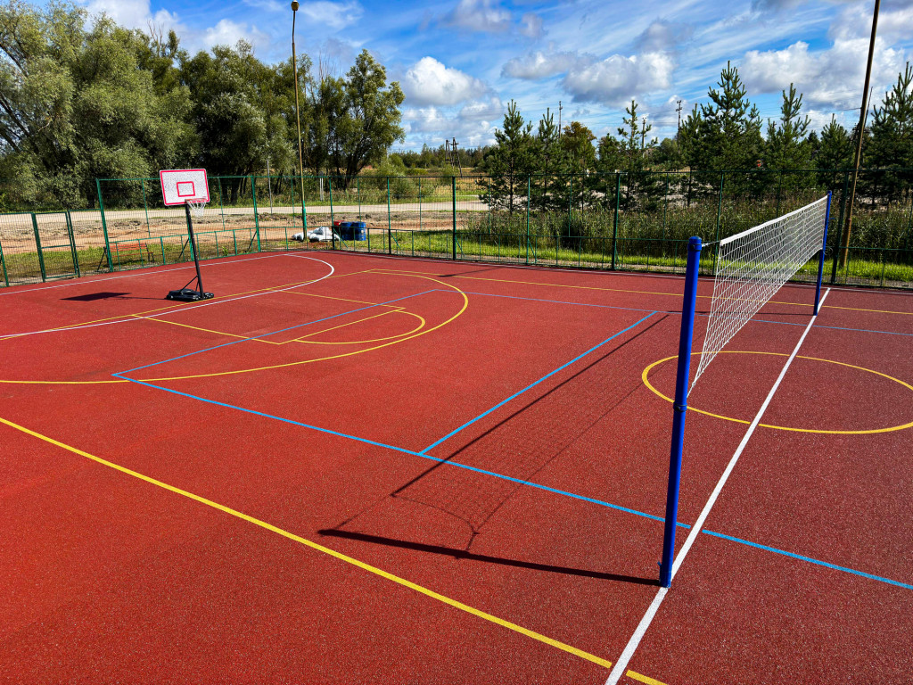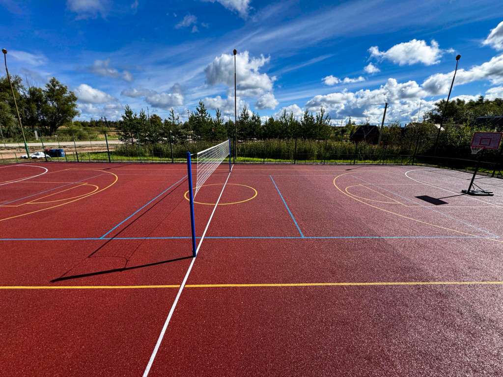 Особое внимание было уделено покрытию: терракотовый цвет гармонично вписался в общую концепцию пространства. Наши дизайнеры подготовили проект разметки для всех спортивных зон, а монтажник Бурнос Иван выполнил её нанесение. Таким образом, площадка получила функциональную организацию пространства и удобство эксплуатации.