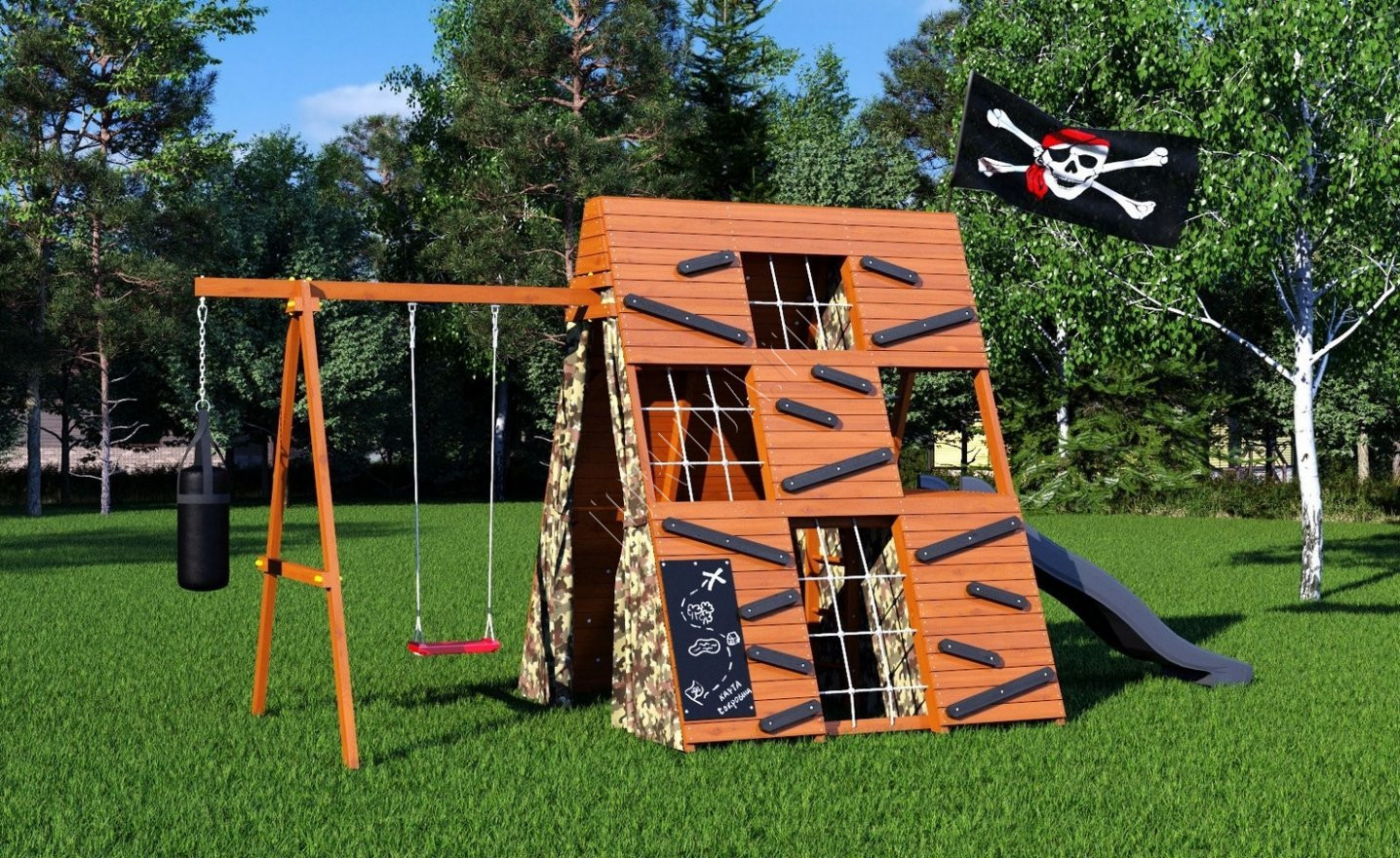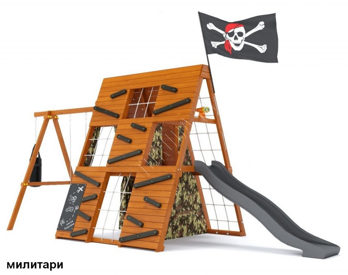 - Занавесы с подхватами способствуют созданию мелодраматических сцен, а наличие меловой доски размером 810х390 мм позволит детям рассказывать свои истории и рисовать картинки. Внутренняя лестница и большой пиратский флаг с флагштоком создадут атмосферу пиратства и игр в прятки.