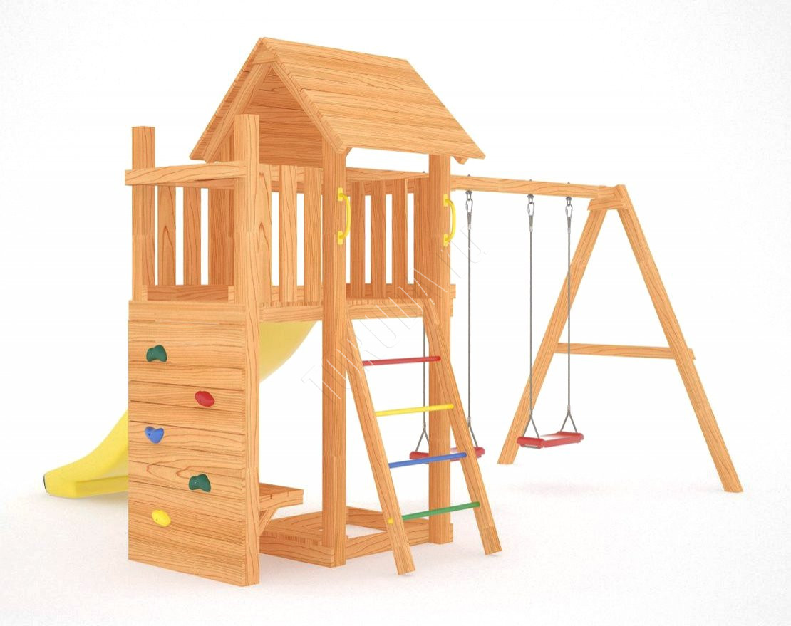 Комплекс безопасен: крепёжные соединения надёжно скрыты под колпачками, качельные подвесы выполнены по ГОСТ, спортивное бельгийское оборудование имеет дополнительный запас прочности.