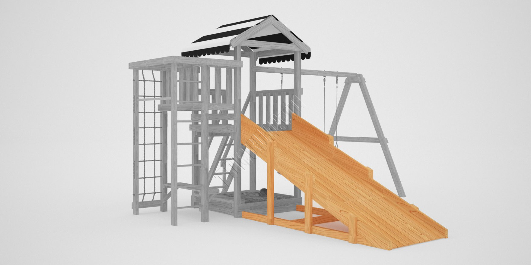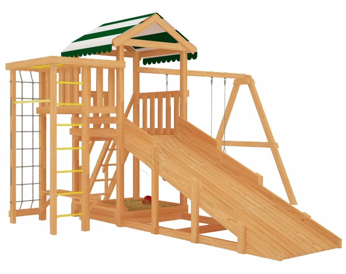 Конструкция сертифицирована и безопасна. Крепежи скрыты под хорошо закрепленными заглушками – поэтому даже малыши не поранятся. Каркас состоит из натуральных деталей – клееного бруса квадратного сечения со стороной 75 мм. Во избежание получения заноз и ссадин дерево отшлифовано, а края скруглены. Материал экологичен и не имеет лакокрасочного покрытия.